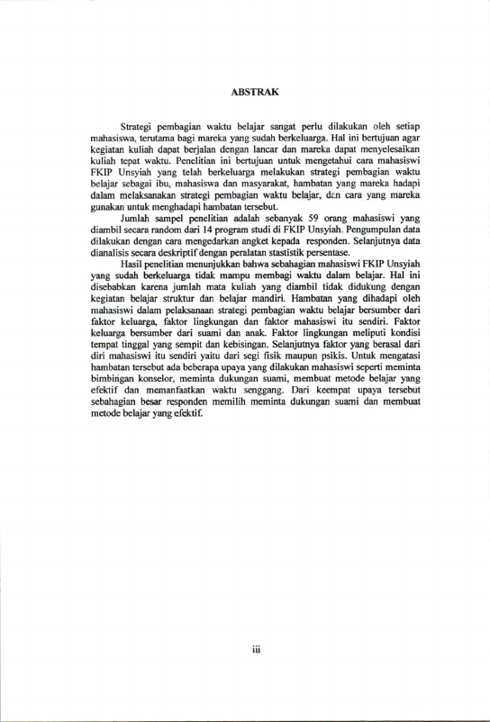 Juliana, STRATEGI PEMBAGIAN WAKTU BELAJAR PADA MAHASISWI YANG TELAH BEKELUARGA (SUATU PENELITIAN PADA FAKULTAS KEGURUAN DAN ILMU PENDIDIKAN UNIVERSITAS SYIAH KUALA). Banda Aceh Universitas Syiah Kuala,2021