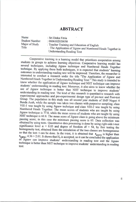 Baca Juga : THE APPLICATION OF JIGSAW TO THE SECOND GRADE OF SENIOR HIGH SCHOOL STUDENTS TO IMPROVE THEIR READING COMPREHENSION ON REPORT TEXT (Fera Busfina Zalha, 2014)