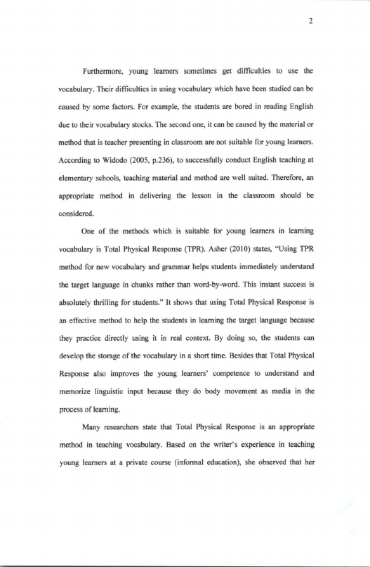 Armiati, THE EFFECTIVENESS OF TOTAL PHYSICAL RESPONSE IN TEACHING VOCABULARY TO YOUNG LEARNERS (A LIBRARY RESEARCH). Banda Aceh Universitas Syiah Kuala,2021