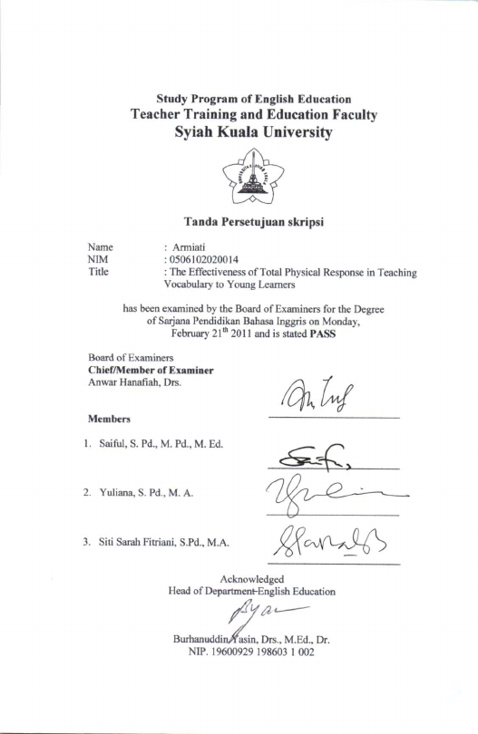 Armiati, THE EFFECTIVENESS OF TOTAL PHYSICAL RESPONSE IN TEACHING VOCABULARY TO YOUNG LEARNERS (A LIBRARY RESEARCH). Banda Aceh Universitas Syiah Kuala,2021