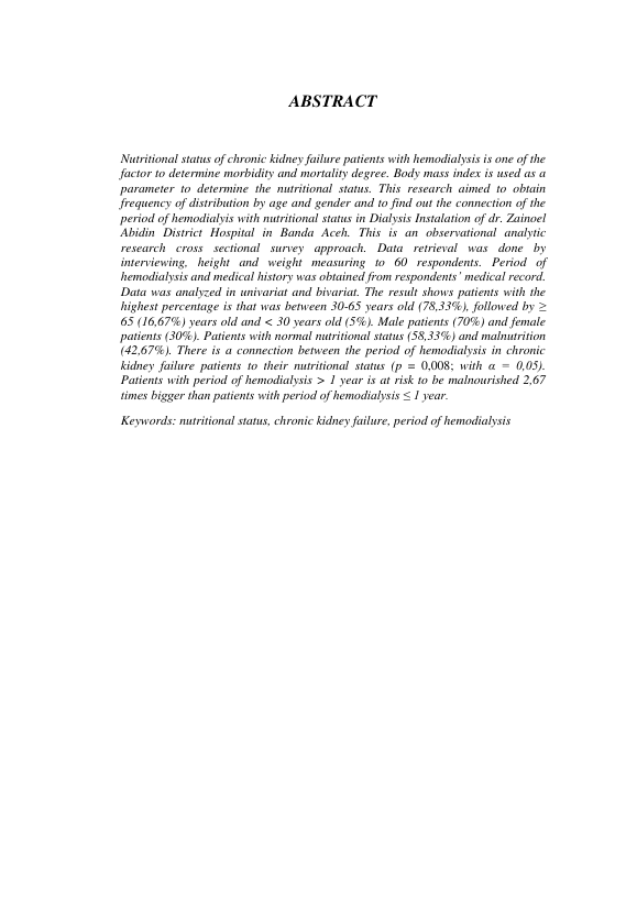 Rizkya Ika Fadilla, HUBUNGAN LAMA WAKTU HEMODIALISIS PENDERITA GAGAL GINJAL KRONIK DENGAN STATUS GIZI DI INSTALASI DIALISIS RUMAH SAKIT UMUM DAERAH DR. ZAINOEL ABIDIN BANDA ACEH. Banda Aceh Fakultas Kedokteran,2012