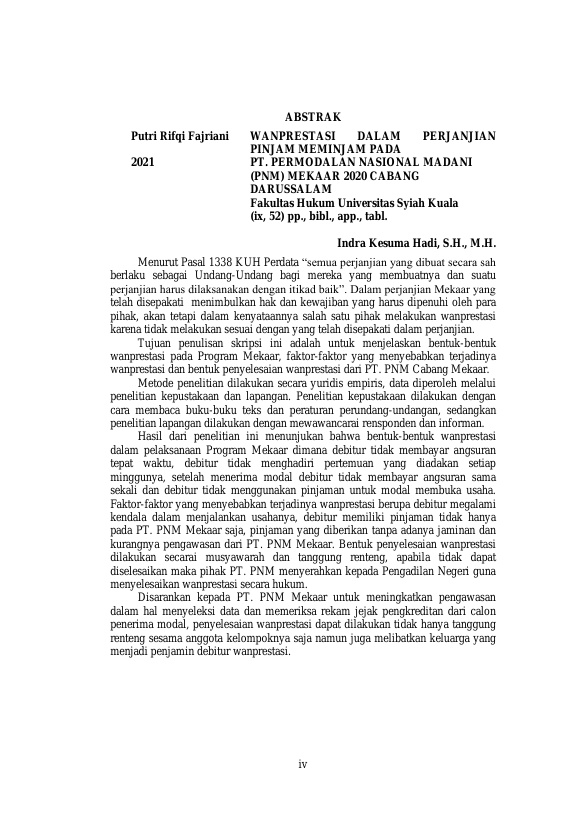 PUTRI RIFQI FAJRIANI, WANPRESTASI DALAM PERJANJIAN PINJAM MEMINJAM PADA PT. PERMODALAN NASIONAL MADANI (PNM) MEKAAR CABANG DARUSSALAM. Banda Aceh Universitas Syiah Kuala,2021