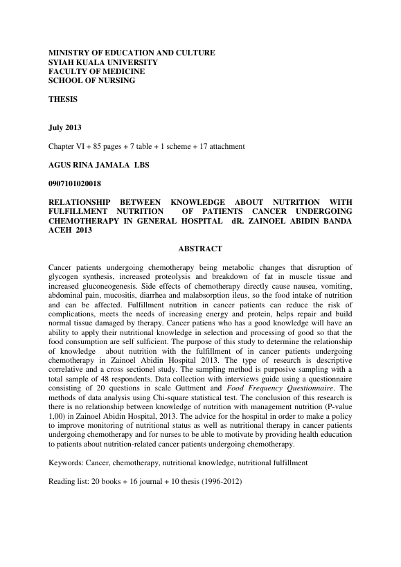 Baca Juga : HUBUNGAN PENGETAHUAN TENTANG GLZI DENGAN PEMENUHAN NUTRISI PADA PASIEN KANKER YANG MENJALANI KEMOTERAPI DI RUMAH SAKIT UMUM DAERAH DR. ZAINOEL ABIDIN BANDA ACEH TAHUN 2013 (Agus Rina Jamala LBS, 2023)