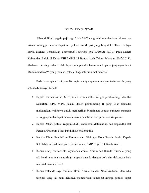 IIN ZIKRA MAULIDA, HASIL BELAJAR SISWA MELALUI PENDEKATAN CONTEXTUAL TEACHING AND LEARNING (CTL) PADA MATERI KUBUS DAN BALOK DI KELAS VIII SMPN 14 BANDA ACEH TAHUN AJARAN 2012/2013. Banda Aceh Fakultas Keguruan dan Ilmu Pendidikan,2013