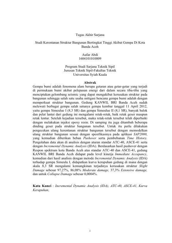 Aufar Abdi, STUDI KERENTANAN STRUKTUR BANGUNAN BERTINGKAT TINGGI AKIBAT GEMPA DI KOTA BANDA ACEH. Banda Aceh Universitas Syiah Kuala,2021
