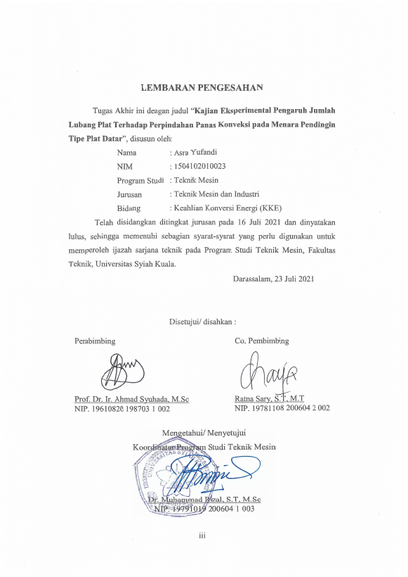 Asra Yufandi, KAJIAN EKSPERIMENTAL PENGARUH JUMLAH LUBANG PLAT TERHADAP PERPINDAHAN PANAS KONVEKSI PADA MENARA PENDINGIN TIPE PLAT DATAR. Banda Aceh Universitas Syiah Kuala,2021