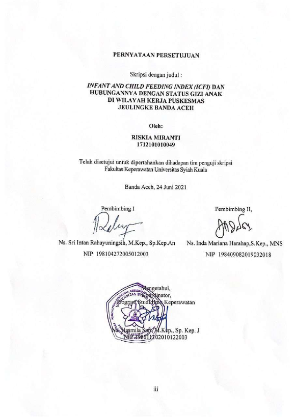 RISKIA MIRANTI, INFANT AND CHILD FEEDING INDEX (ICFI) DAN HUBUNGANNYA DENGAN STATUS GIZI ANAK DI WILAYAH KERJA PUSKESMAS JEULINGKE BANDA ACEH. Banda Aceh Universitas Syiah Kuala,2021