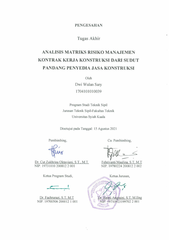 Baca Juga : ANALISIS MATRIKS RISIKO MANAJEMEN KONTRAK KERJA KONSTRUKSI DARI SUDUT PANDANG PENGGUNA JASA KONSTRUKSI (ALFANSURI TASWIN, 2021)