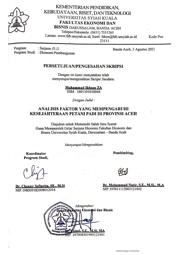 MUHAMMAD IKHSAN ZA, ANALISIS FAKTOR YANG MEMPENGARUHI KESEJAHTERAAN PETANI PADI DI PROVINSI ACEH. Banda Aceh Universitas Syiah Kuala,2021