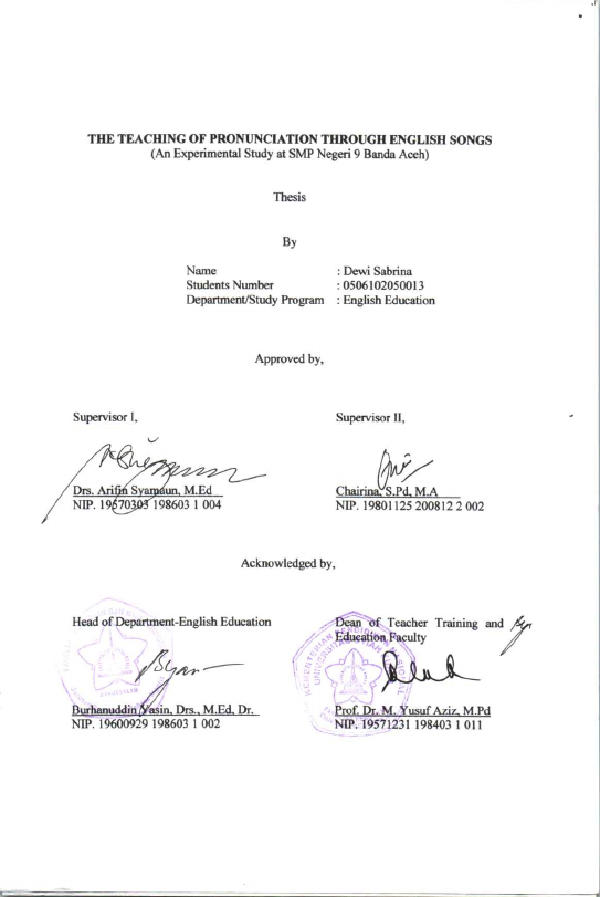 Baca Juga : THE TEACHING OF PRONUNCIATION THROUGH ENGLISH SONGS (AN EXPERIMENTAL STUDY AT SMP NEGERI 9 BANDA ACEH) (Dewi Sabrina, 2021)
