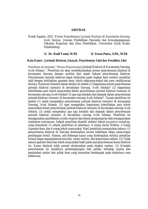 WARDI SAPUTRA, PROSES PENYELESAIAN JARIMAH KHALWAT (MESUM) DI KECAMATAN SAWANG, ACEH SELATAN. Banda Aceh Universitas Syiah Kuala,2021