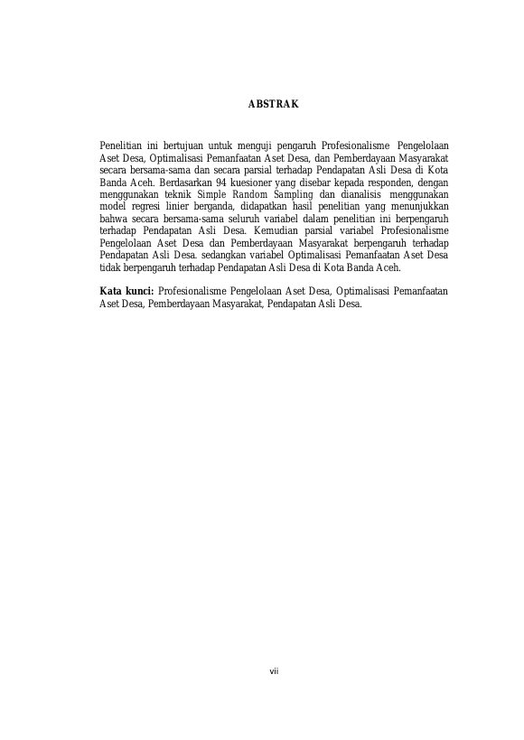 ISTIQAMAH, PENGARUH PROFESIONALISME PENGELOLAAN ASET DESA, OPTIMALISASI PEMANFAATAN ASET DESA, DAN PEMBERDAYAAN MASYARAKAT TERHADAP PENDAPATAN ASLI DESA (STUDI EMPIRIS PADA DESA DI KOTA BANDA ACEH). Banda Aceh Universitas Syiah Kuala,2021