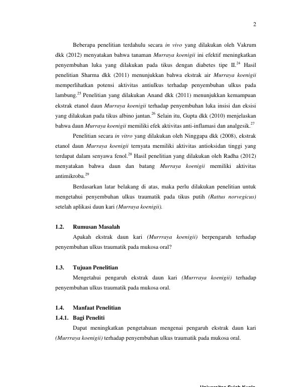 Baca Juga : PENGARUH EKSTRAK DAUN KARI (MURRAYA KOENIGII) TERHADAP PENYEMBUHAN ULKUS TRAUMATIK PADA MUKOSA ORAL(PENELITIAN PADA TIKUS MODEL) (Dini Alsandy, 2014)
