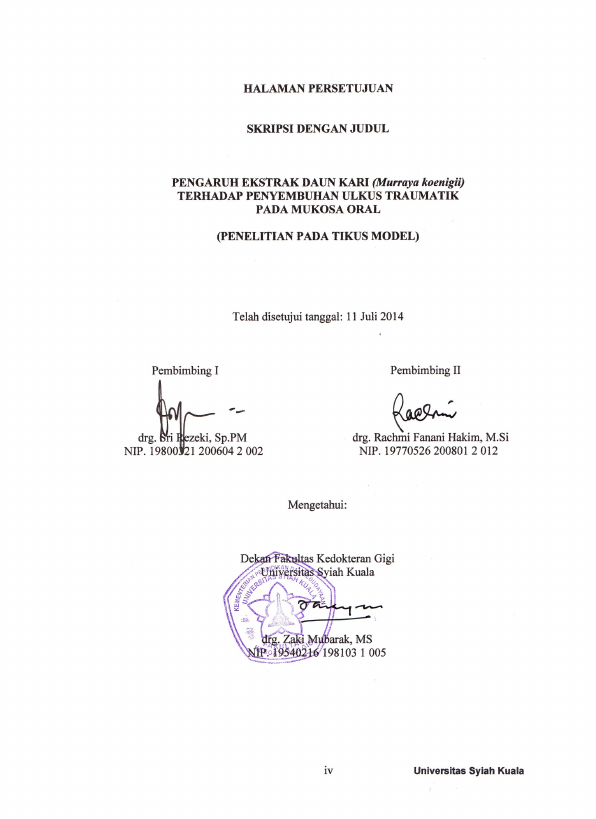 Baca Juga : PENGARUH EKSTRAK DAUN KARI (MURRAYA KOENIGII) TERHADAP PENYEMBUHAN ULKUS TRAUMATIK PADA MUKOSA ORAL(PENELITIAN PADA TIKUS MODEL) (Dini Alsandy, 2014)
