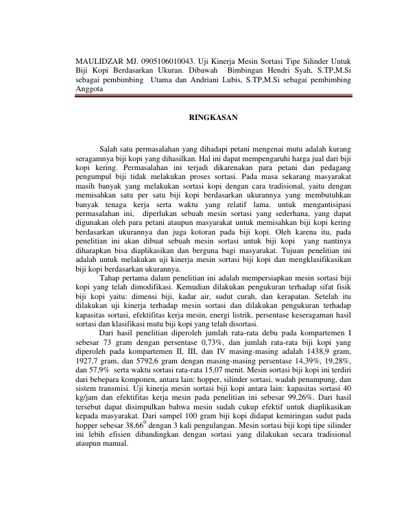 Baca Juga : MODIFIKASI DAN UJI KINERJA MESIN SORTASI BIJI KOPI ARABIKA (COFFEA ARABIKA) (Andri Jayadi, 2018)