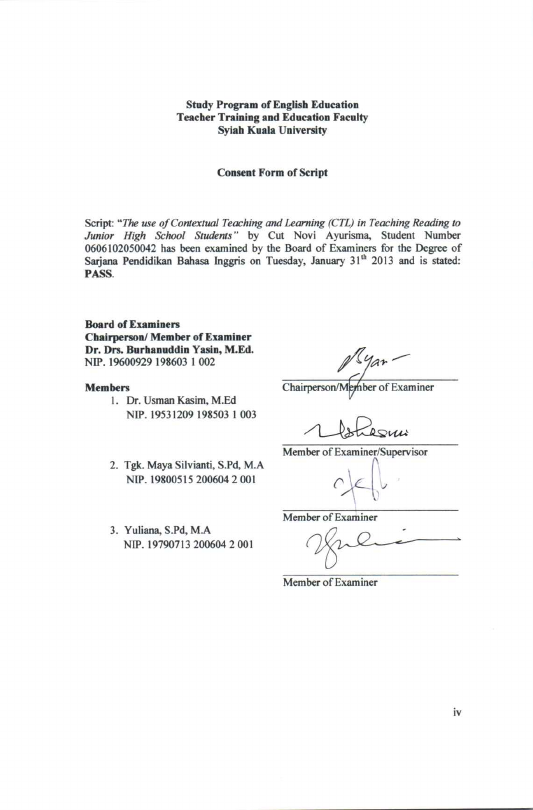 Cut Novi Ayurisma, THE USE OF CONTEXTUAL TEACHING AND LEARNING (CTL) IN TEACHING READING TO JUNIOR HIGH SCHOOL STUDENTS. Banda Aceh Universitas Syiah Kuala,2021