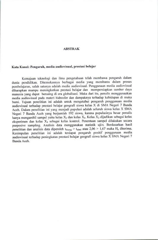 Engki Falgiansyah, PENGARUH PENGGUNAAN MEDIA AUDIOVISUAL TERHADAP PRESTASI BELAJAR GEOGRAFI SISWA KELAS X SMA NEGERI 7 BANDA ACEH. Banda Aceh Fakultas Keguruan dan Ilmu Pendidikan,2011