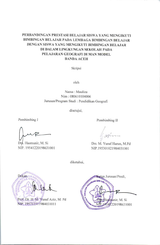 Mauliza, PERBANDINGAN PRESTASI BELAJAR SISWA YANG MENGIKUTI BIMBINGAN BELAJAR PADA LEMBAGA BIMBINGAN BELAJAR DENGAN SISWA YANG MENGIKUTI BIMBINGAN BELAJAR DIDALAM LINGKUNGAN SEKOLAH PADA PELAJARAN GEOGRAFI DI MAN MODEL BANDA ACEH. Banda Aceh Fakultas Keguruan dan Ilmu Pendidikan,2012