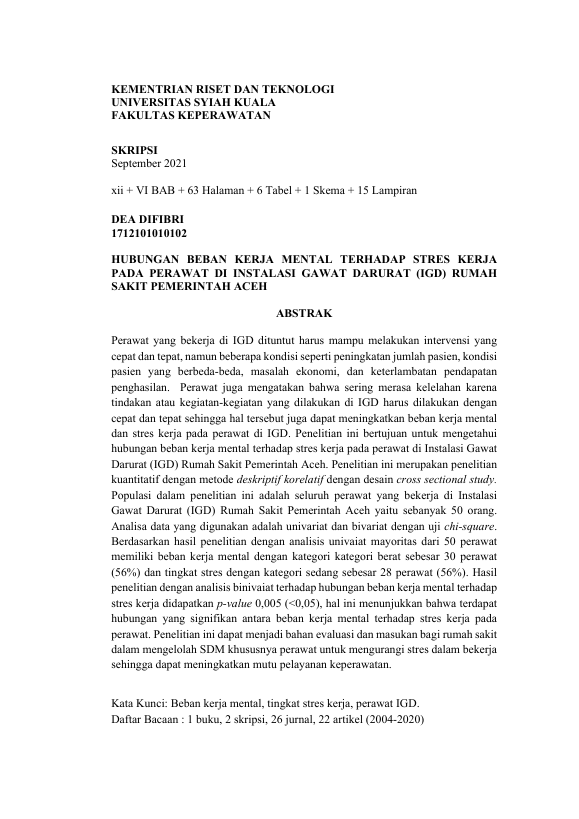 DEA DIFIBRI, HUBUNGAN BEBAN KERJA MENTAL TERHADAP STRES KERJA PADA PERAWAT DI INSTALASI GAWAT DARURAT (IGD) RUMAH SAKIT PEMERINTAH ACEH. Banda Aceh Fakultas Keperawatan,2021