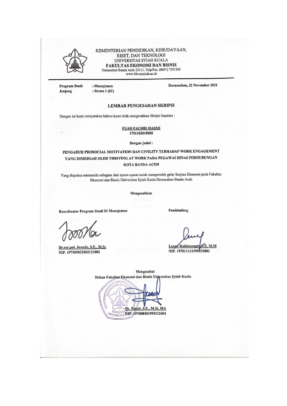 FUAD FACHRI HASMI, PENGARUH PROSOCIAL MOTIVATION DAN CIVILITY RNTERHADAP WORK ENGAGEMENT YANG DIMEDIASI OLEH THRIVING AT WORK PADA PEGAWAI DINAS PERHUBUNGAN KOTA BANDA ACEH. Banda Aceh Fakultas Ekonomi,2021