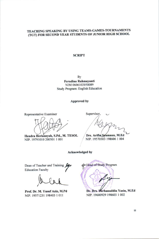 Feradina Rahmayanti, TEACHING SPEAKING BY USING TEAMS- GAMES-TOURNAME NTS (TGT) FOR SECOND YEAR STUD ENTS OF JUNI OR HIGH SCHOOL. Banda Aceh Fakultas Keguruan dan Ilmu Pendidikan,2013