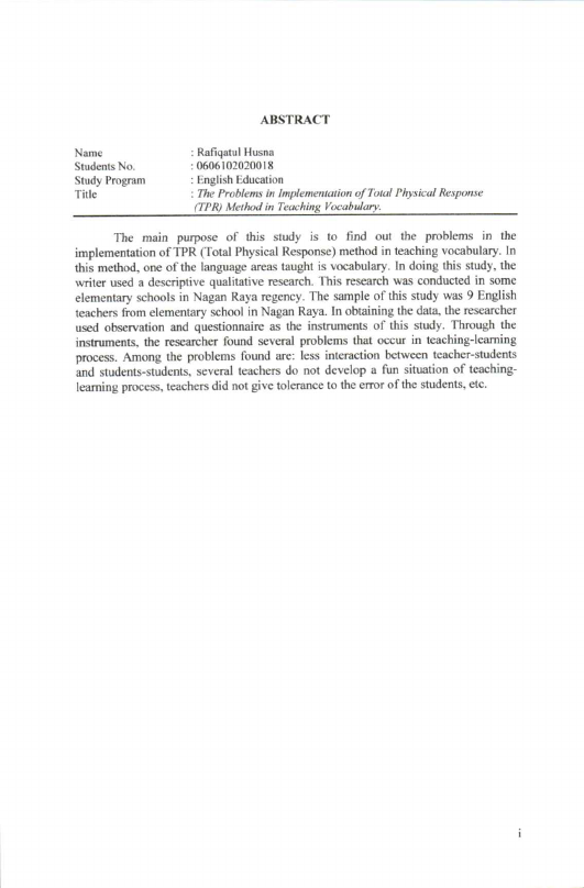 Baca Juga : THE USE OF TOTAL PHYSICAL RESPONSE (TPR) METHOD IN TEACHING ENGLISH VOCABULARY TO YOUNG LEARNERS(EXPERIMENTAL STUDY AT SD NEGERI 19 BANDA ACEH) (zul fitriana, 2014)