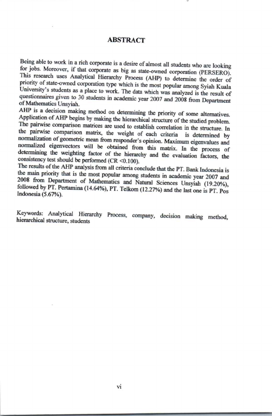 Ryzka Ade Novi Andika, PEMILIHAN PERUSAHAAN SEBAGAI TEMPAT BEKERJA MENGGUNAKAN METODE ANALYTICAL HIERARCHY PROCESS (AHP)RN(STUDI KASUS PADA MAHASISWA JURUSAN MATEMATIKA FMIPA UNSYIAH). Banda Aceh Fakultas Matematika dan Ilmu Pengetahuan Alam,2013