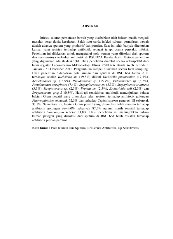 Muhammad Ansari Adista, POLA KUMAN YANG DIISOLASI DARI SPUTUMRNDAN RESISTENSINYA TERHADAP ANTIBIOTIKRNDI RSUDZA TAHUN 2011. Banda Aceh Fakultas Kedokteran,2012