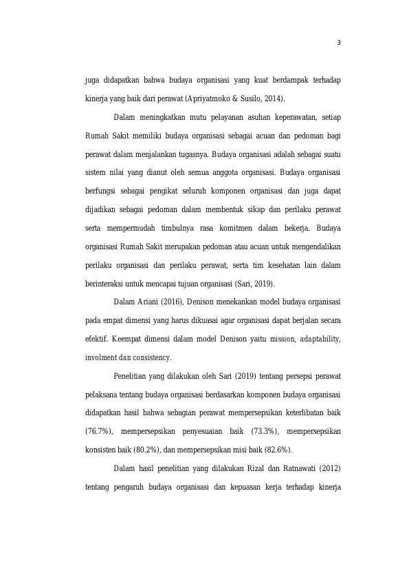 USI RETNO ZULYANTY, HUBUNGAN BUDAYA ORGANISASI DENGAN KINERJA PERAWAT PELAKSANA DI RUANG RAWAT INAP RUMAH SAKIT BANDA ACEH. Banda Aceh Fakultas Keperawatan,2021