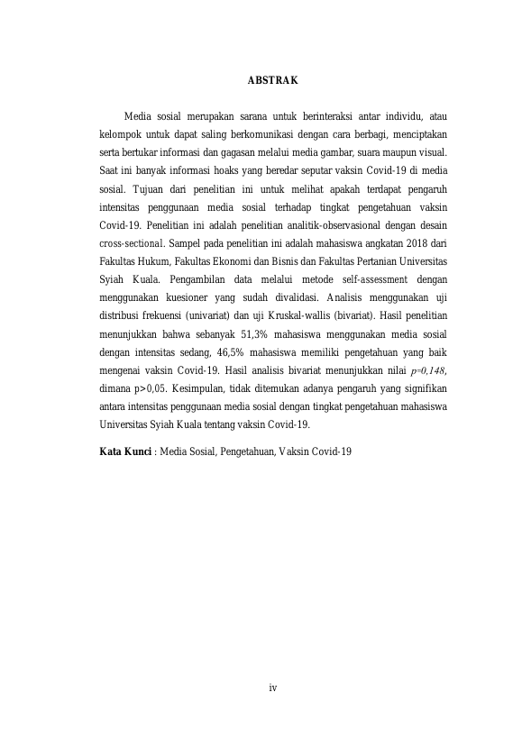 PENGARUH PENGGUNAAN MEDIA SOSIAL TERHADAP TINGKAT PENGETAHUAN MAHASISWA UNIVERSITAS SYIAH KUALA TENTANG VAKSIN CORONAVIRUS DISEASE 2019 (COVID-19) THE INFLUENCE OF THE USE OF SOCIAL MEDIA TO THE LEVEL OF KNOWLEDGE ON STUDENT OF SYIAH KUALA UNIVERSITY ABOUT VACCINE CORONAVIRUS DISEASE 2019 (COVID-19). Banda Aceh Fakultas Kedokteran,2021