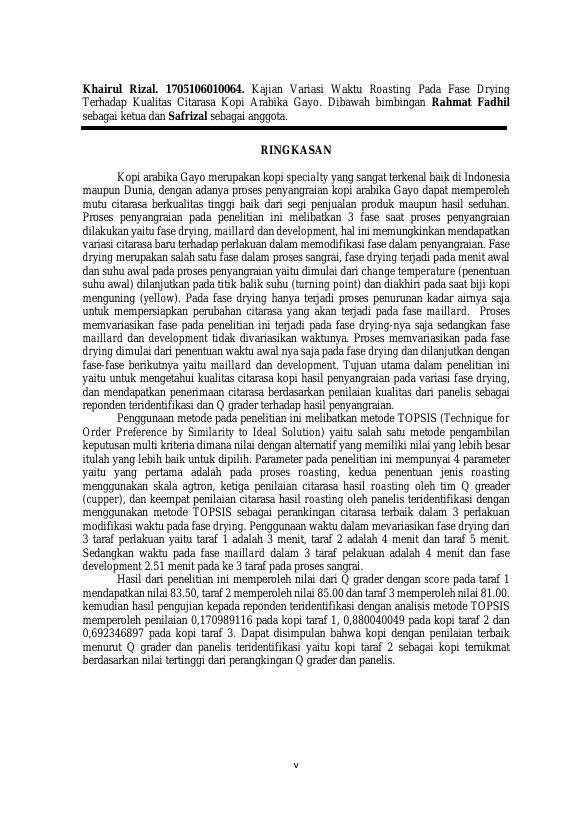 KHAIRUL RIZAL, KAJIAN VARIASI WAKTU ROASTING PADA FASE DRYING TERHADAP KUALITAS CITARASA KOPI ARABIKA GAYO. Banda Aceh Fakultas Pertanian,2022