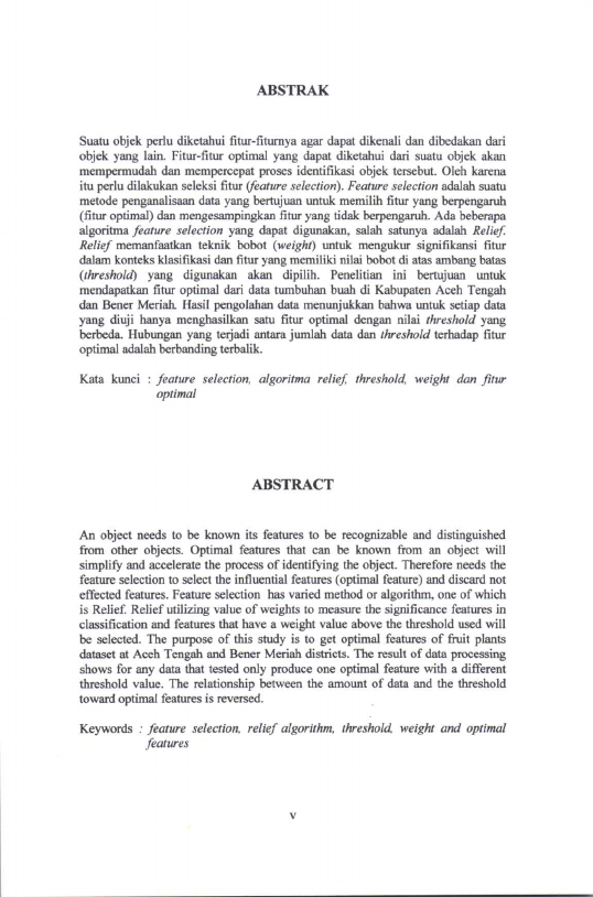 Martina Navatilova, FEATURE SELECTION DENGAN ALGORITMA RELIEF UNTUK KLASIFIKASI DATA TUMBUHAN BUAH. Banda Aceh Fakultas Matematika dan Ilmu Pengetahuan Alam,2010