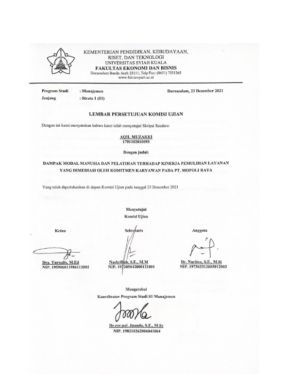 AQIL MUZAKKI, DAMPAK MODAL MANUSIA DAN PELATIHAN TERHADAP KINERJA PEMULIHAN LAYANAN DENGAN PERAN MEDIASI KOMITMEN KARYAWAN PADA PT. MOPOLI RAYA. Banda Aceh Fakultas Ekonomi dan Bisnis,2022