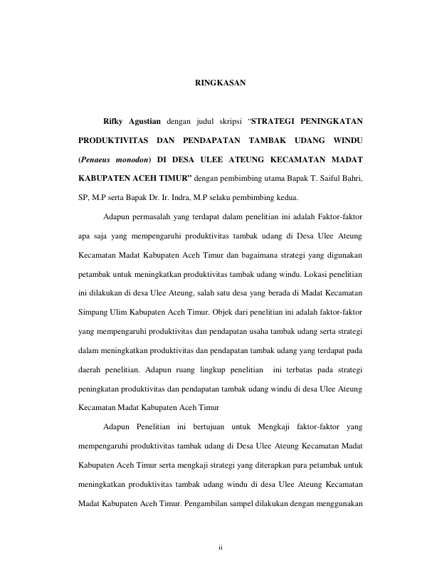 RIFKY AGUSTIAN, STRATEGI PENINGKATAN PRODUKTIVITAS DAN PENDAPATAN TAMBAK UDANG WINDU (PENAEUS MONODON)DI DESA ULEE ATEUNG KECAMATAN MADAT KABUPATEN ACEH TIMUR. Banda Aceh Fakultas Pertanian,2014