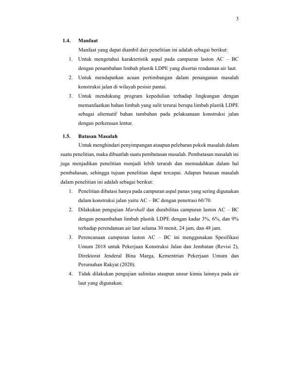 Baca Juga : KAJIAN PENAMBAHAN LIMBAH LOW DENSITY POLYETHYLENE (LDPE) PADA CAMPURAN LASTON LAPIS AUS (AC – WC) DENGAN VARIASI DURASI RENDAMAN AIR LAUT (MEUTIA MUKHRINA, 2021)