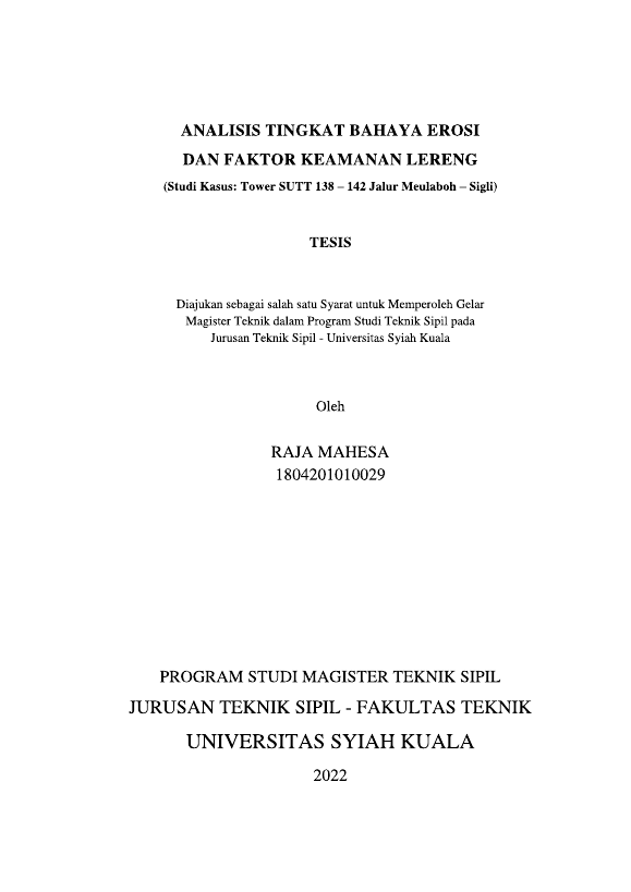 Baca Juga : ANALISIS TINGKAT BAHAYA EROSI DAN FAKTOR KEAMANAN LERENGRN(STUDI KASUS: TOWER SUTT 138 – 142 JALUR MEULABOH – SIGLI) (Raja Mahesa, 2022)