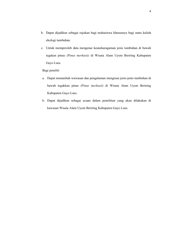 Masyitah, KEANEKARAGAMMANJENISTUMBUHANBAWAHTEGAKAANPINUSRN(PINUSMERKUSII)DIIWISATAALAMUYEMBERIRINGKABUUPATENRNGAYOLUES. Banda Aceh Fakultas Kip (S1),2022