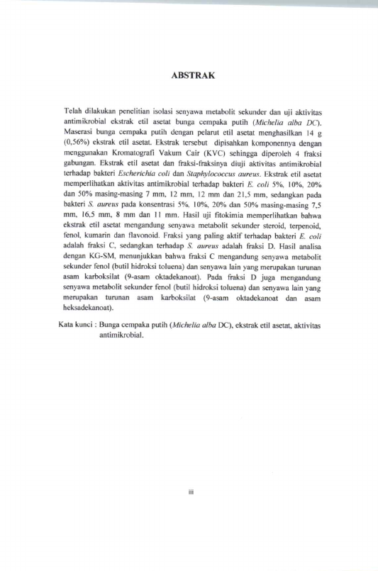 Baca Juga : ISOLASI DAN UJI AKTIVITAS ANTIOKSIDAN DARI EKSTRAK BUNGA CEMPAKA PUTIH (MICHELIA ALBA D.C.) (Irma Suryani, 2018)