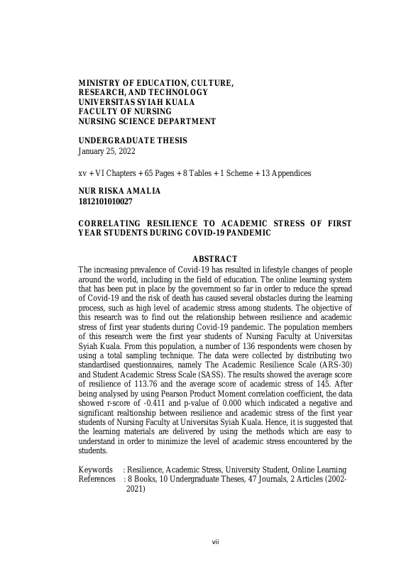 Nur Riska Amalia, HUBUNGAN RESILIENSI DIRI DENGAN STRES AKADEMIK MAHASISWA TAHUN PERTAMA DI MASA PANDEMI COVID-19. Banda Aceh Fakultas Keperawatan,2022