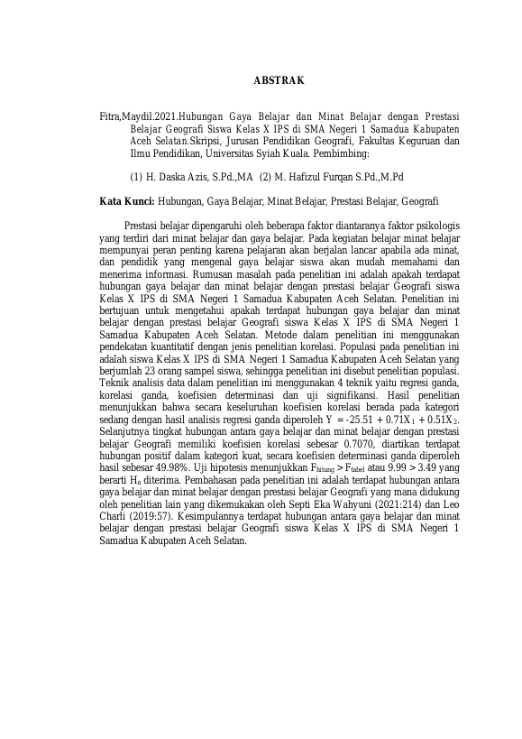 Baca Juga : KORELASI KECENDERUNGAN MINAT BELAJAR DENGAN PRESTASI BELAJAR SISWA DALAM MATA PELAJARAN GEOGRAFI DI SMA NEGERI 1 TIMANG GAJAH KECAMATAN GAJAH PUTIH KABUPATEN BENER MERIAH (Yurahayana, 2021)
