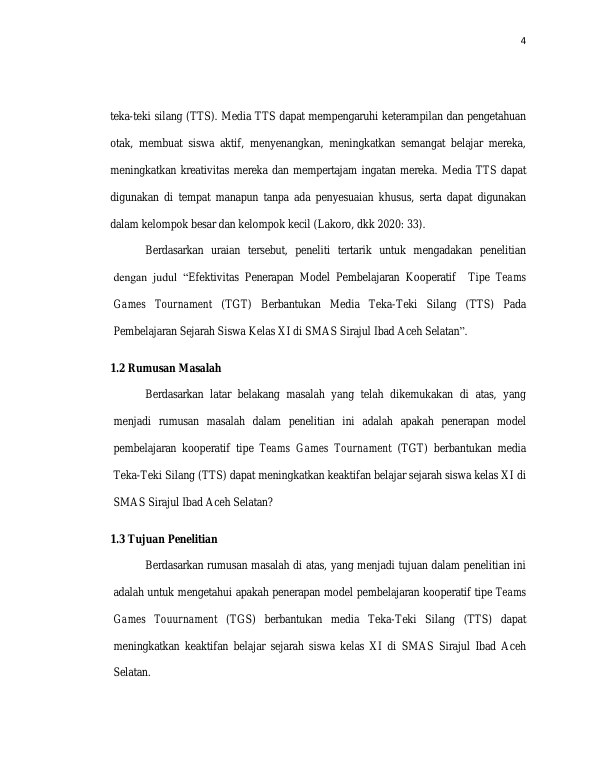 EVA SUWIRDA, EFEKTIVITAS PENERAPAN MODEL PEMBELAJARAN KOOPERATIF TIPE TEAMS GAMES TOURNAMENT (TGT) BERBANTUKAN MEDIA TEKA-TEKI SILANG (TTS) PADA PEMBELAJARAN SEJARAH SISWA KELAS XIRNDI SMAS SIRAJUL IBAD ACEH SELATAN. Banda Aceh Fakultas KIP Pendidikan Sejarah,2022