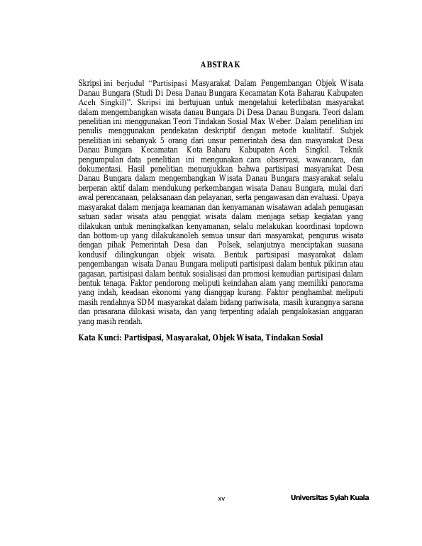 Suryadi, PARTISIPASIIMASYARAKAT DALAMIPENGEMBANGAN OBJEK WISATA DANAU BUNGARA RN(STUDI DI DESA DANAU BUNGARA KECAMATAN KOTA BAHARU KABUPATENNACEH SINGKIL). Banda Aceh Fakultas Ilmu Sosial dan ilmu Politik,2022