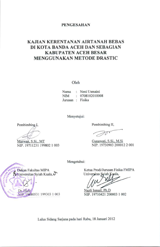 Neni Usmaini, KAJIAN KERENTANAN AIR TANAH BEBAS DI KOTA BANDA ACEH DAN SEBAGIAN KABUPATEN ACEH BESAR MENGGUNAKAN METODE DRASTIC. Banda Aceh Fakultas Matematika dan Ilmu Pengetahuan Alam,2012